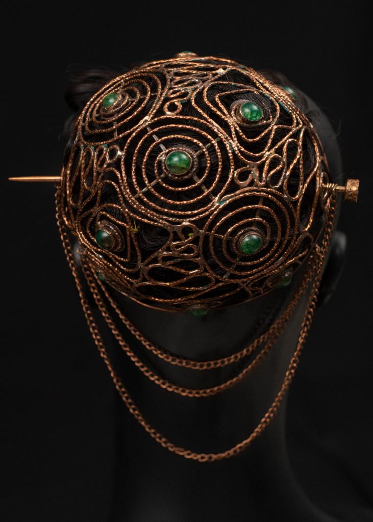 An elaborate domed head ornament crafted from copper filigree, inset with glowing green garnets. The intricate design and soft chains suggest fertility, growth, and renewal.