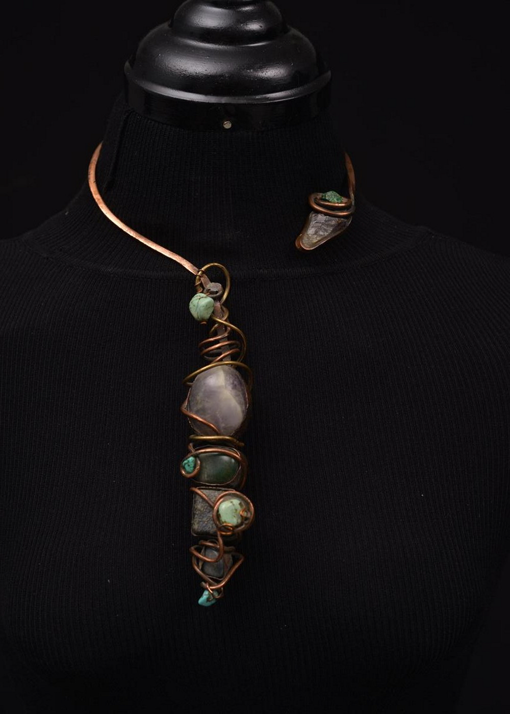 This striking necklace features a cluster of turquoise, malachite, sodalite, amethyst, and jade stones, wired with pure copper for a bold yet comfortable statement piece.