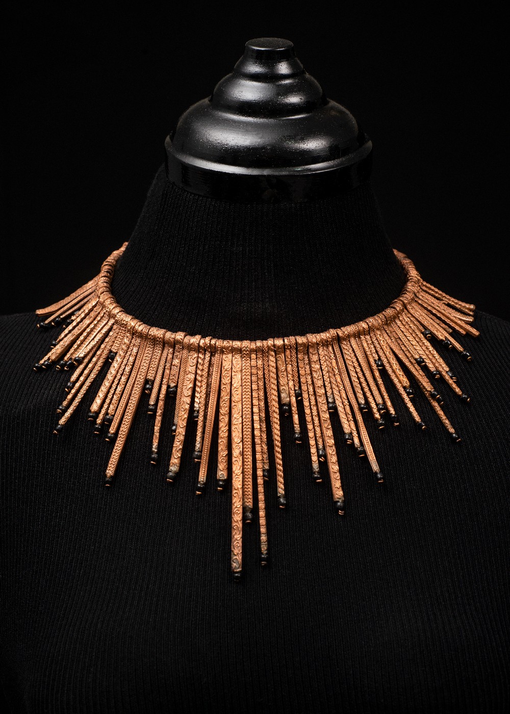 Command attention with the regal athena, a bold and empowering handcrafted copper choker featuring the grounding energy of black agate. Known for its protective and stabilizing qualities, this statement necklace is designed to inspire confidence, strength, and success.