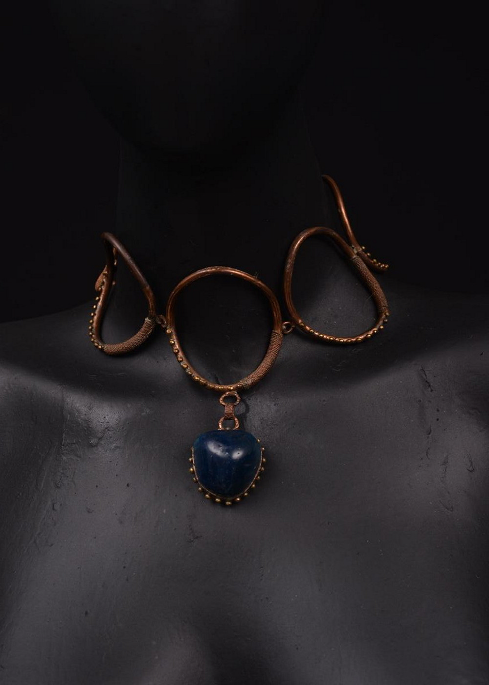 This captivating loop choker features a rare deep blue agate stone, reflecting the world around you. Finished with our signature logo at the back — a piece to wear with pride.