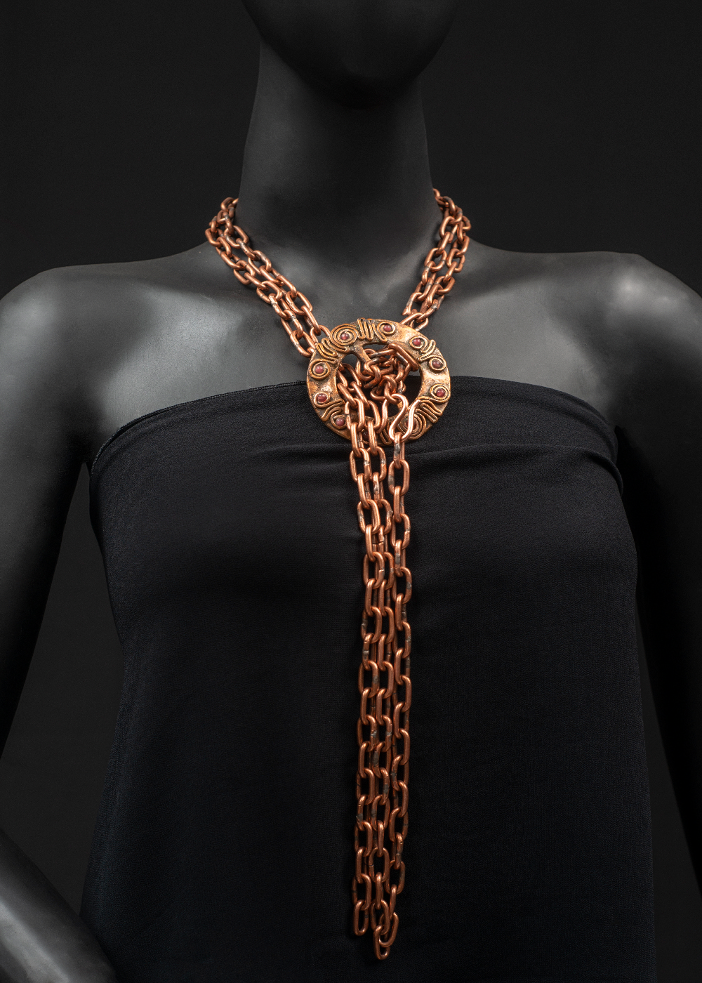 A bold, cascading copper chain adorned with rich ruby beads, symbolizing passion and strength. The circular pendant represents eternity and divine unity, echoing Hera’s enduring power and authority.
