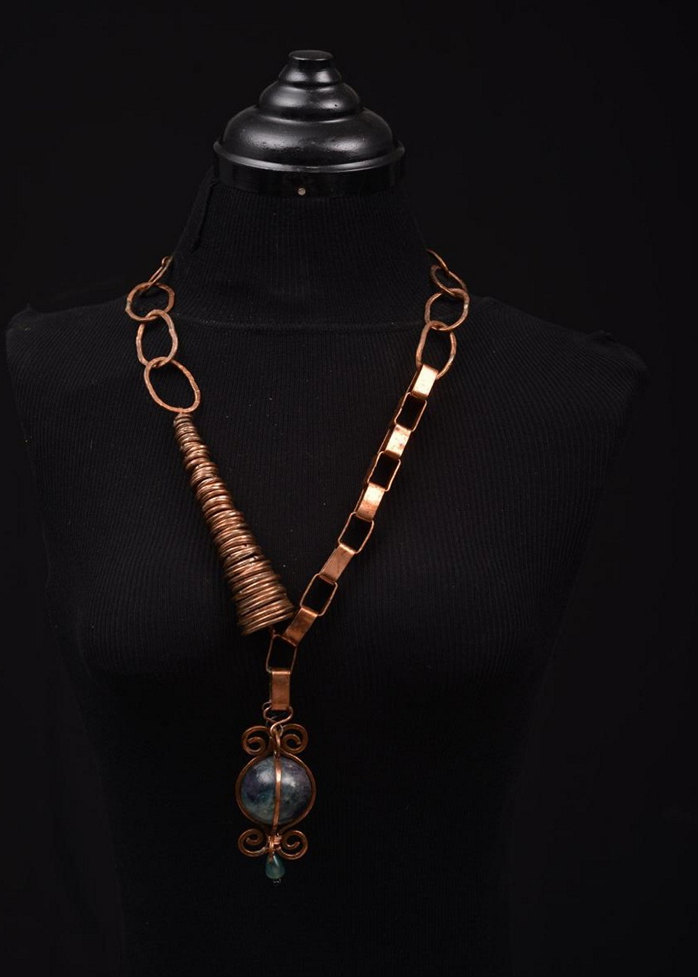 Harness your inner strength with the empowered globe, a handcrafted copper necklace featuring a powerful fluorite sphere and elegant green aventurine pendant. Known for enhancing focus, resilience, and personal growth, this striking piece combines rich copper textures with healing gemstones for a bold yet refined look.