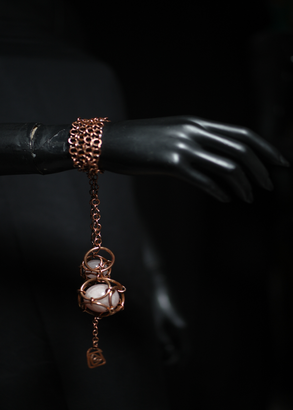 Twin orbs of rose quartz drift in copper cages, tethered by chains like celestial bodies held in perfect tension. Their glow is subtle, liquid, ancient — a dance between freedom and gravity.