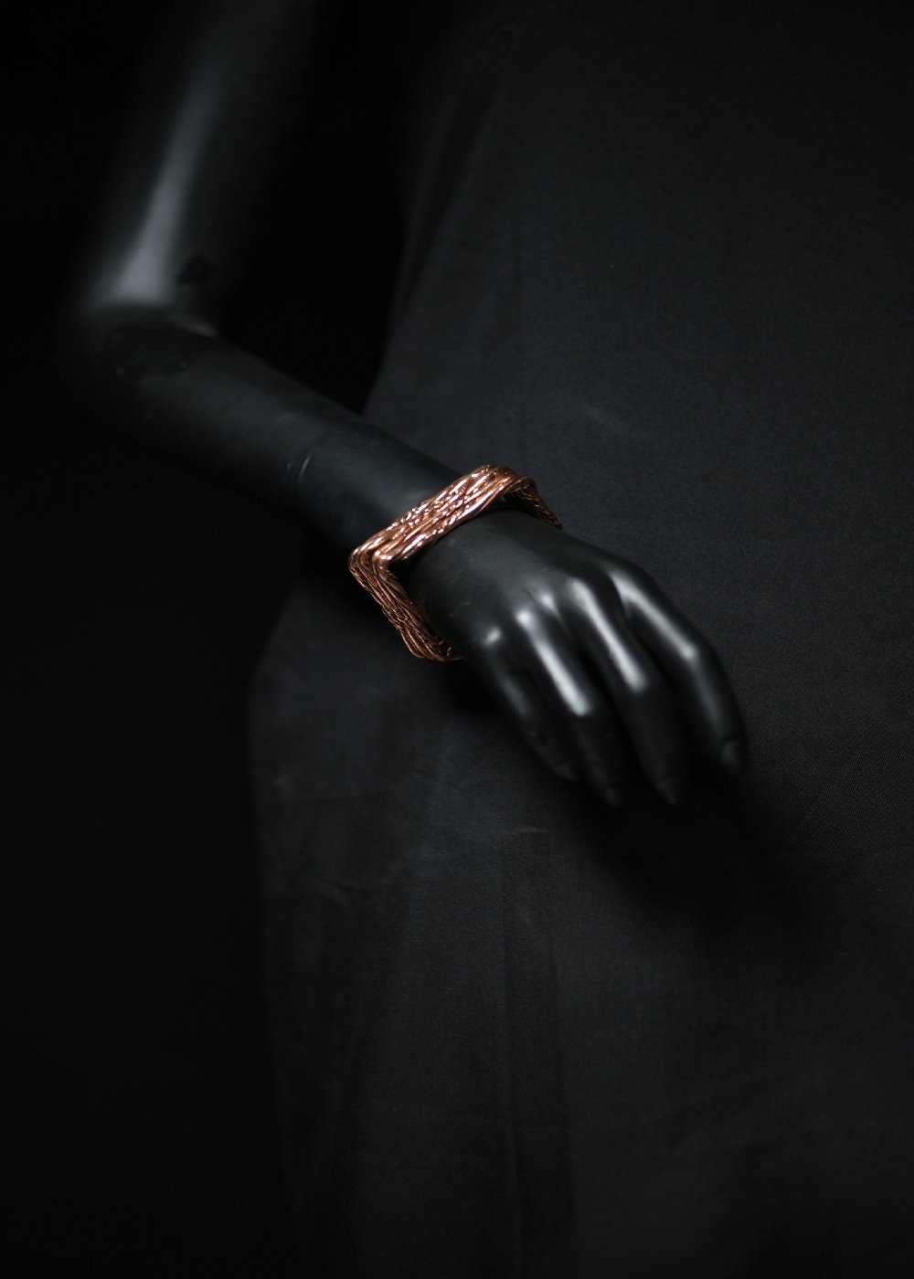 Interwoven copper lines form a geometric sculpture around the wrist — a tribute to balance, structure, and precision. The piece speaks of endurance, hand-forged rhythm, and the quiet beauty of repetition.