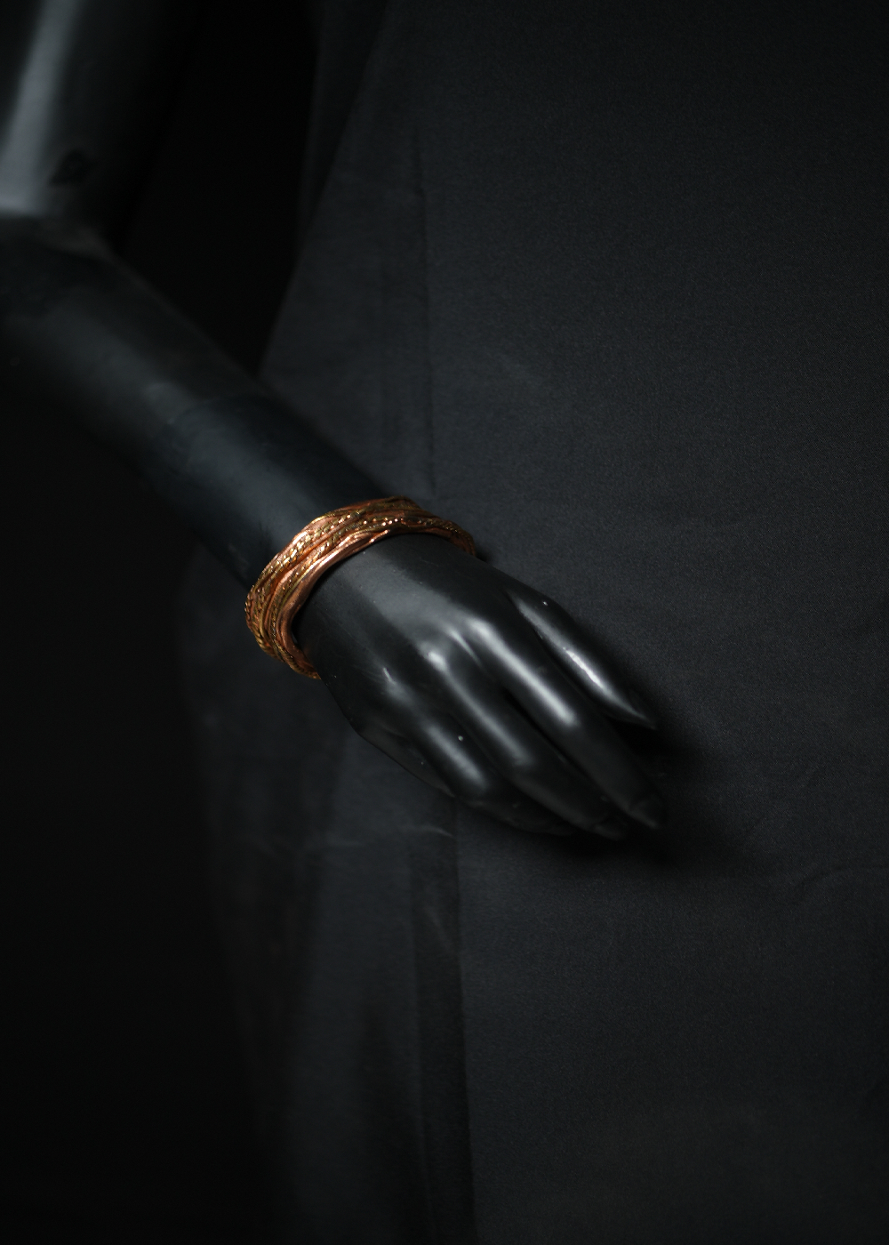 A set of organically hammered copper bangles that resonate like ancient instruments. Their rhythm against the skin recalls movement, dance, and time — the eternal sound of craftsmanship echoing through touch.