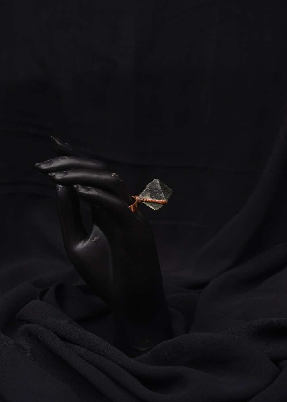 A hand-forged copper band embraces a crystalline quartz point, embodying purity and strength. A minimalist piece radiating quiet power.