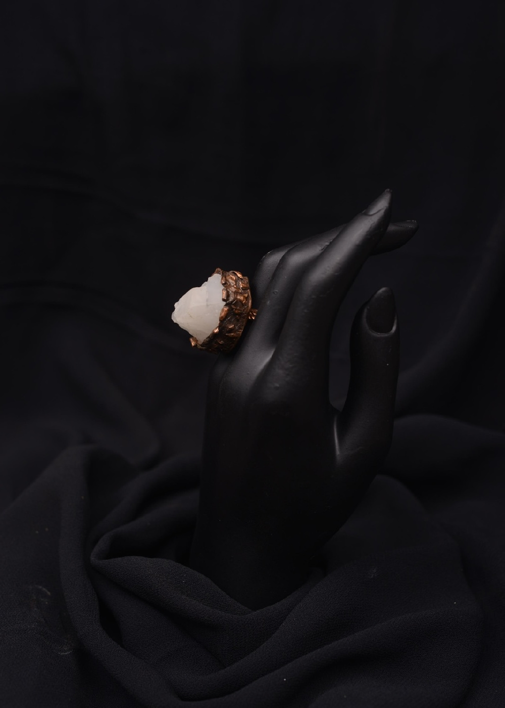 Raw and radiant, this natural white moonstone crystal is framed in rugged copper, glowing with ethereal lunar energy.