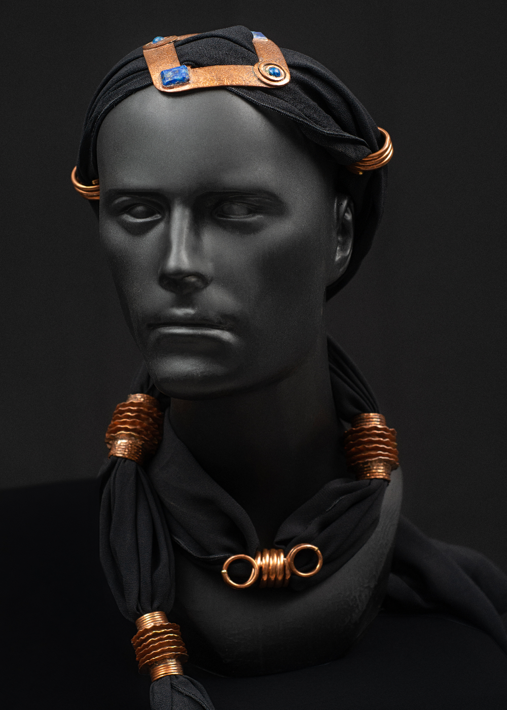 A fluid head scarf piece featuring lapis lazuli framed in textured copper, designed to echo the movement of fabric and light. The copper pieces can be easily taken off, making it possible to use in any scarf of your choice